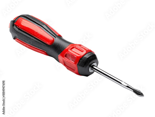 screwdriver, tool, hardware, repair, maintenance, construction, bricolage, fixing, handyman, equipment, object, handle, metal, steel, chrome, sharp, point, bit, slot, manual, work, industry, hand, instrument, craft, mechanical, engineering, workshop, garage, shed, toolbox, screw, fastener, drive, rotate, turn, grip, ergonomic, professional, domestic, household, red, black, shiny, clean, isolated, transparent, background