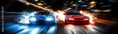 Red and blue sports cars racing at night with light trails on a road.