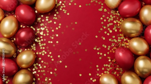 Red And Gold Balloons And Confetti Scatter Across A Deep Red Background, celebratory backdrop or festive banner, copy space