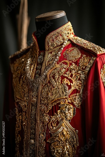gold, garment, design, pattern, red, embroidery, historical, dressmaker, clothing, fabric, vintage, jacket, intricate, embroidered, elegant, traditional, texture, up, tailor, floral, style, detail, textile, royals, close, decorative, ornate, fashion, luxury