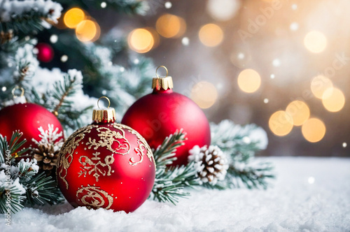 Red and Golden christmas decorations, ornaments, spruce tree and snow with light bokeh background.