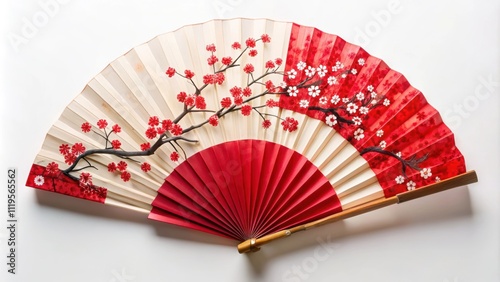 Red and white hand fan with plum blossom design, traditional, Japanese, culture, pattern, decoration, silk