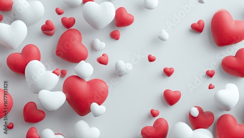 heart, red, white, love, valentine, romance, three-dimensional, floating, scattered, background, celebration, design, graphic, image, decoration, festive, romantic, pastel, art, digital, illustration, graphic design, pattern, texture, affection, passion, symbol, symbolism, holiday, graphic, digital artwork