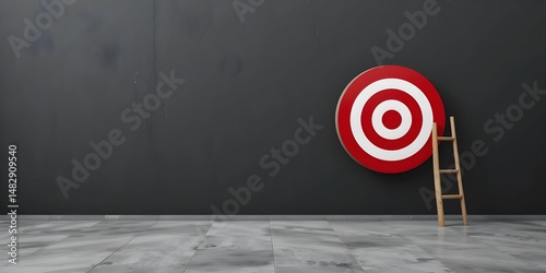 Red and White Target with Wooden Ladder on Dark Background Representing Business Goals, Strategic Planning, Career Growth, and Success Achievement Concept