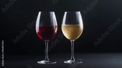 Red and white wine glasses side by side against a dark background showcasing elegance and contrast in colors and textures of the wines
