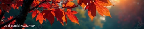 Red and yellow green foliage on a tree branch with blue undertones, foliage, red