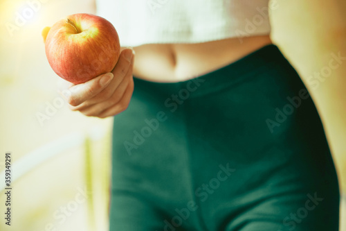 Red apple in a female hand. Young athletic body of a girl in leggings and a top. Fitness and Health concept