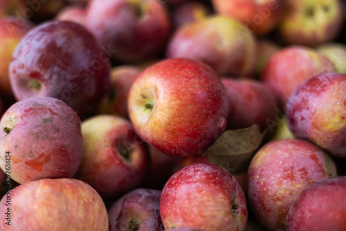 Red apples on the counter of the farmers market. Natural products, seasonal fruits, local food