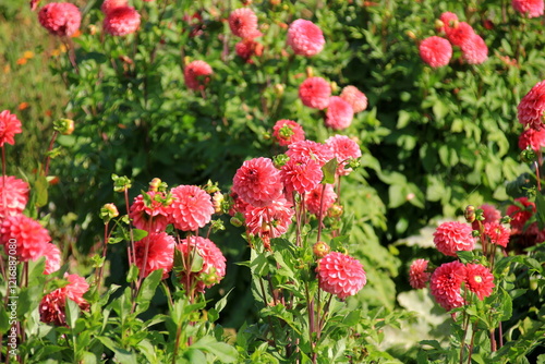 Red asters blooming in the garden on a sunny summer day