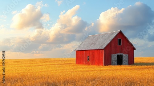 red, barn, field, wheat, gold, sky, cloud, rural, agriculture, farm, landscape, sunset, summer, countryside, scenic, tranquil, peaceful, solitude, rustic, vintage, weathered, wood, metal, open, door, window, horizon, nature, colours, beauty