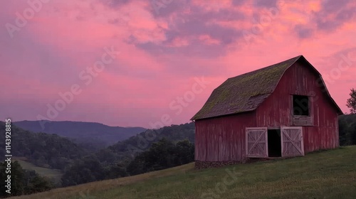 barn, red, sunset, sunrise, sky, cloud, pink, purple, landscape, rural, country, farm, agriculture, hill, mountain, field, grass, nature, outdoors, scenic, view, beautiful, picturesque, tranquil, serene, peaceful, calm, evening, twilight, light, colours, vibrant, rustic, old, weathered, wood, structure, building, architecture, scene, image, photo, photo, picture, background, design, element