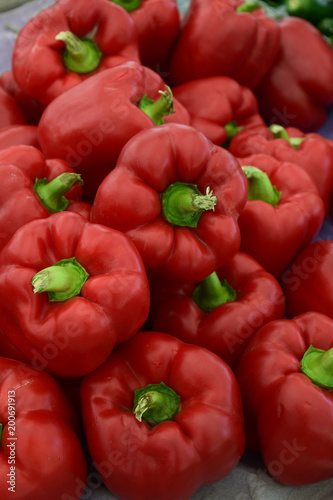Red bell peppers stacked at farmers market.