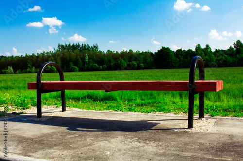 red, bench, being, near, to, a, city, and, about, field, wood, on, the, nature, rest, wooden, paint, is, painted, trip, green, dark, blue, sky, balustrade, travel, expectation, grass, tree, tree, material, from, created