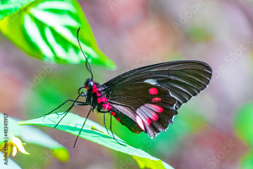 Red black noble tropical butterfly on green nature background brazil.