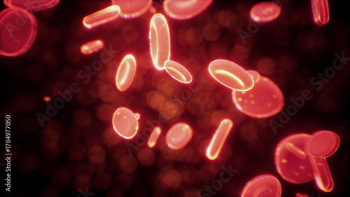 Red blood cells float in a dark, vibrant space, illuminated with a glowing effect. The visual illustrates their movement, showcasing their importance in the human body.