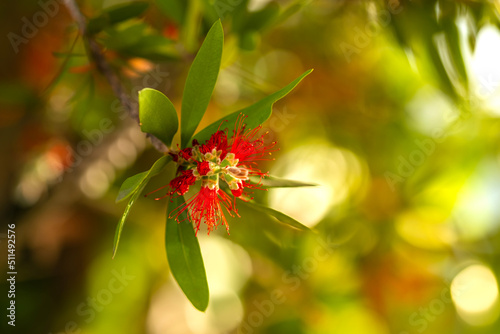 Red bottlebrush flower. Bottlebrush or Little John - Dwarf Callistemon. Selective focus, blurry background, close up