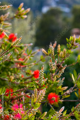 Red bottlebrush flower. Bottlebrush or Little John - Dwarf Callistemon. Selective focus, blurry background, close up. Copy space