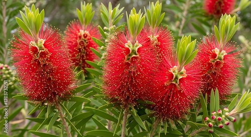 bottlebrush, flower, red, bloom, plant, flora, blossom, flower, nature, botanical, bright, high-coloured, colours, green, foliage, bush, shrub, floral, beauty, vibrant, summer, spring, garden, closeup, macro, photo, image, picture, detail, texture, flower petals, stamen, pistil, flowering, wildflower, australian, native, exotic, tropical, landscape, environment, ecosystem, wildlife, habitat, botany, horticulture, cultivation