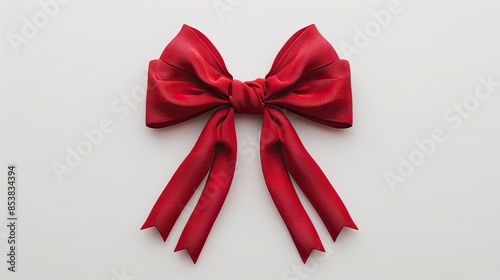 Red bow, realistic style, on a white background, front view, no shadow. The red ribbon is symmetrical, has a smooth surface with soft lighting, which creates a festive atmosphere.