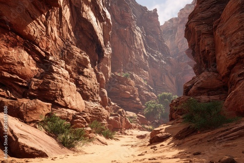 canyon, gorge, red, rock, wall, path, sandy, sunlight, desert, narrow, terrain, nature, landscape, vista, mountain, red rock, arid, sun, dry, rocky, vegetation, plant, shrub, pathway, travel, adventure, exploration, hiking, trekking, scenic, beauty, imposing, rugged, natural, dramatic, geology, texture, light, shadow, spectacular, journey