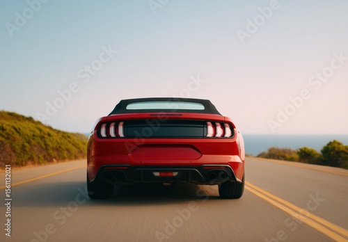 cabrio, red, highway, coastal, ocean, sunny, car, driving, road, sunset, travel, adventure, freedom, journey, landscape, scenic, nature, sea, coast, vehicle, automobile, transportation, sport, muscle, luxury, open, top, rear, view, summer, vacation, holiday, weekend, get-away, escape, fun, excitement, lifestyle, aspiration, dream