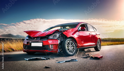 red car showing significant damage after a road accident highlighting the dangers of traffic collisions