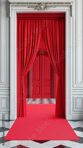 red, carpet, entrance, door, curtain, grand, reveal, interior, design, architecture, elegant, luxury, room, classic, formal, dramatic, stylish, rich, royals, stage, theatre, velvet, fabric, texture, gateway, opening, ceremony, sophistication, prestige, opulent, entranceway, passage, threshold, corridor, hallway, white, floor, framing