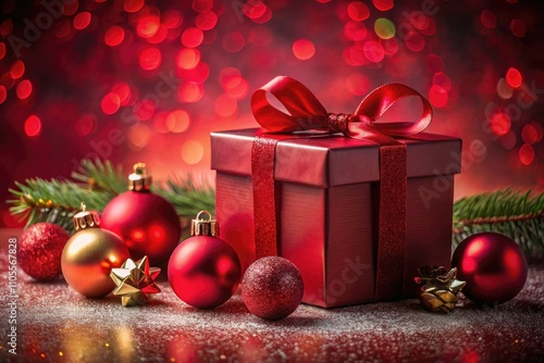 Red Christmas Gift Box, Ornaments, Festive Background - Holiday Season Decoration Image