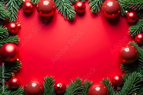 Red Christmas scene: pine branches, shiny ornaments frame blank card on vibrant red background. Festive holiday flat lay.