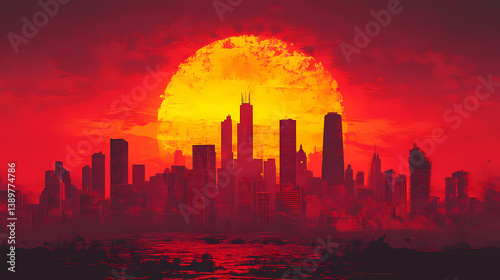 Red city skyline sunset, apocalyptic landscape, fiery art. Doomed Horizon. Illustration