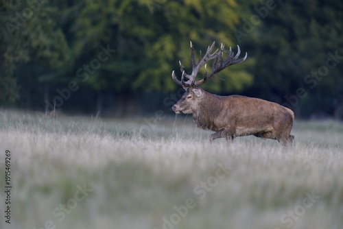 Red deer (Cervus elaphus), with mud in antlers after wallowing running in a meadow, rutting, Zealand, Denmark
