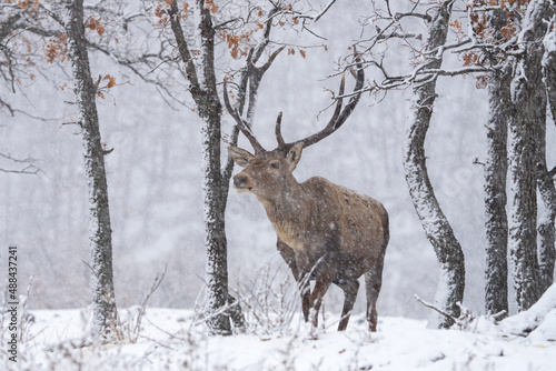 Red deer during winter season. Deer in the forest. European nature. Animals in Rhodope mountains.