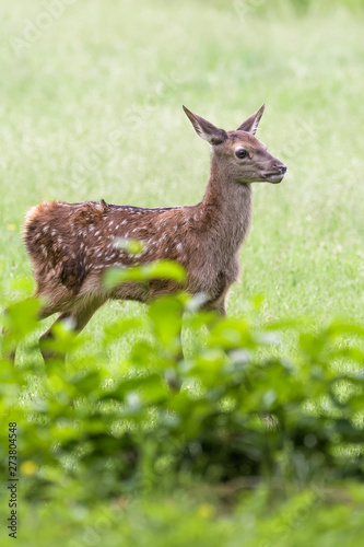 Red deer fawn running around in a meadow