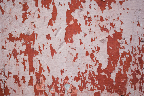 Red dirty peeled plaster wall with falling off flakes of paint.