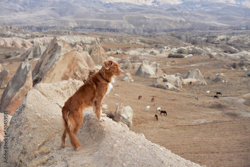 Red dog in cappadocia against the backdrop of the sandy mountains. Nova Scotia Duck Tolling Retriever at sunrise