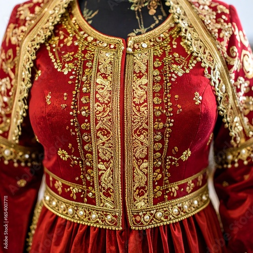 embroidery, jacket, red, gold, detail, beaded, dress, fashion, clothing, textile, design, traditional, ethnic, ornament, vintage, folk, sewing, hand-made, beautiful, elegant, luxury, style, woman, lady, bridal