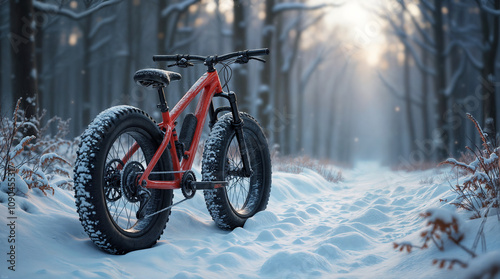 red fatbike stands against the backdrop of a winter forest. Generative AI