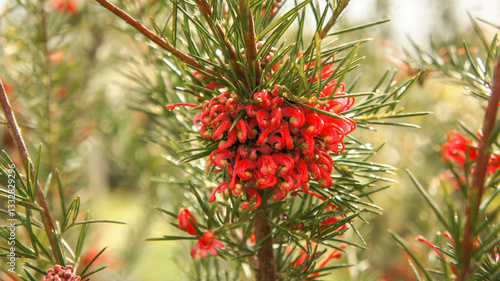 Red flowers of Grevillea rosmarinifolia or rosemary grevillea, shrub with linear, narrowly elliptic or narrowly oblong leaves with edges rolled under, in the garden or landscape architecture design