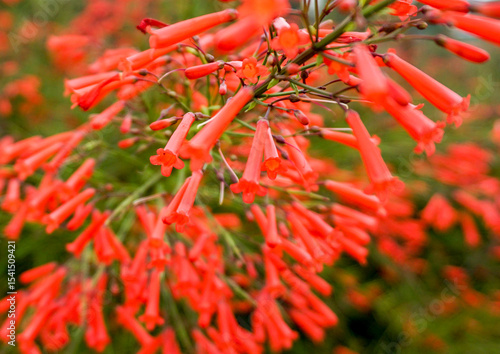 Red flowers of Phyllocarpus septentrionalis Donn. Smith (Monkey Flower Tree, Fire of Pakistan) on tree. Blurred and defocused.