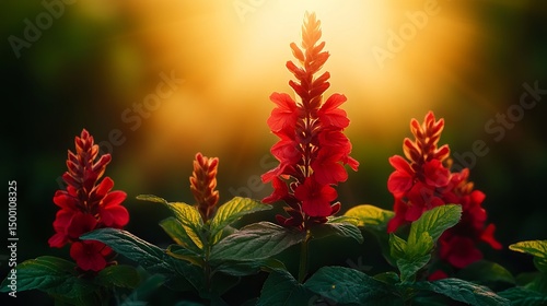 Red flowers stand illuminated with sunlight shining in the background, creating a beautiful scene.