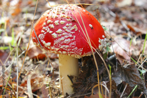 Red fly agaric in the forest. Amanita muscaria mushroom is photographed close-up in the forest.