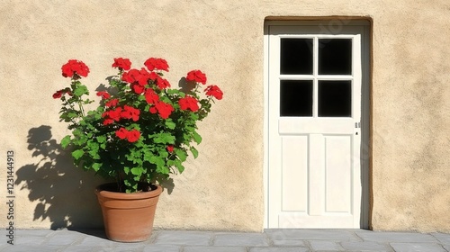 geranium, red, flower, pot, door, house, summer, sun, plant, wall, terracotta, blossom, bloom, garden, exterior, building, home, floral, plantation, nature, outside, sunshine, day, bright, beauty, colours, rustic, vintage, countryside, mediterranean, architecture, design, decor, landscaping, property, lifestyle, peaceful, tranquil, serene, background, image, photo, stock