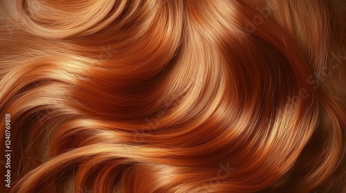 Red hair close-up as background. Long red hair of women. Beautifully styled wavy shiny locks. Hair coloring. Hairdressing procedures, extensions, hair care and coloring.