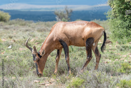 Red hartebeest with broken horn grazing
