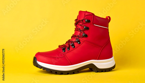 boot, shoe, red shoes, footwear, red, yellow background, studio shot, fashion, clothing, accessory, lifestyle, style, adventure, travel, warm, comfortable, hard-wearing, stylish, bright, vibrant, bold, sporty, contemporary, equipment, gear