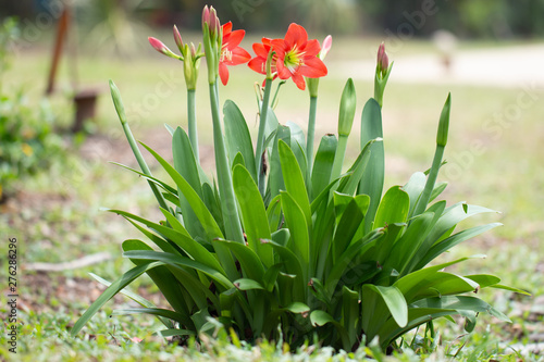 Red Hippeastrum flower or Red Amaryllis flowers on green natural blurred background
