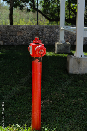 Red hydrant on a green meadow. Fire safety in public places