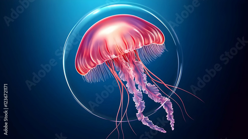 Red jellyfish in a light ring, deep ocean background; marine life, underwater world, science, education