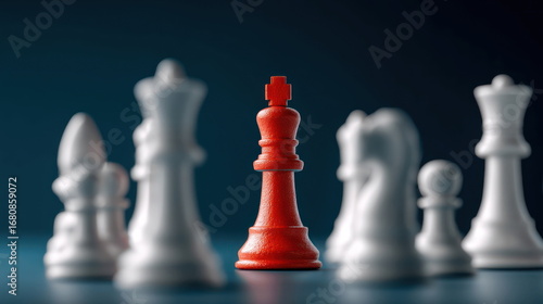 Red king chess piece stands out among white pieces on a dark background during an intense match Generative AI