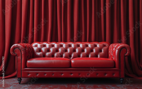 Red Leather Sofa Against Red Curtain, 3D Rendering for Living Room or Theater Stage Decoration